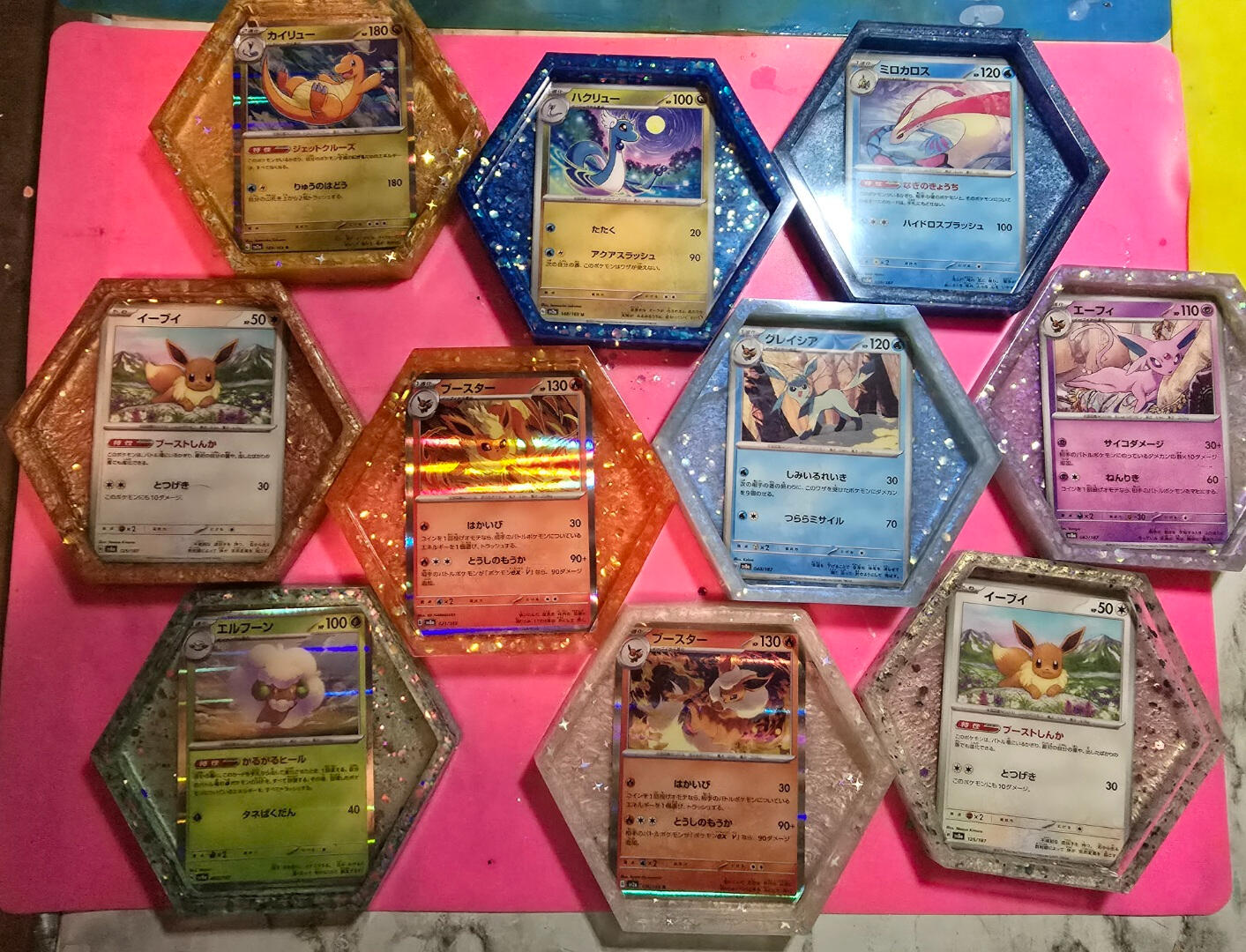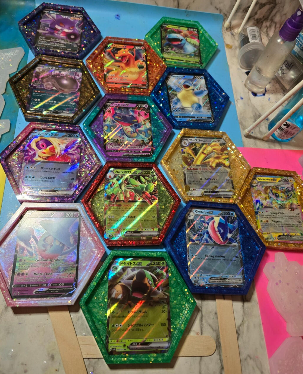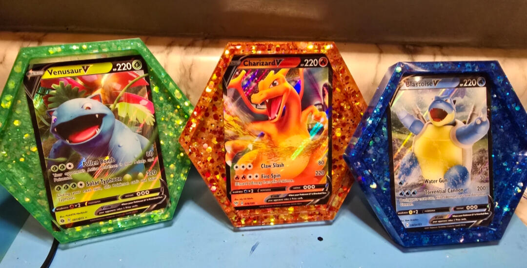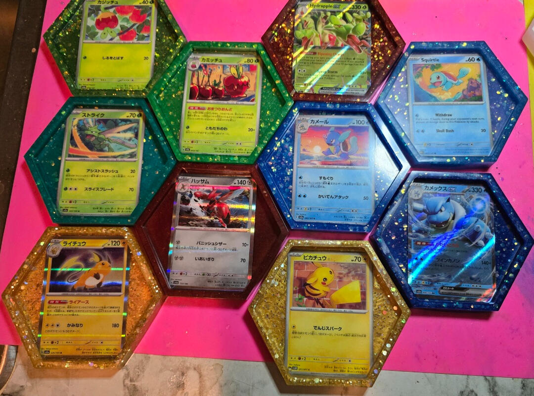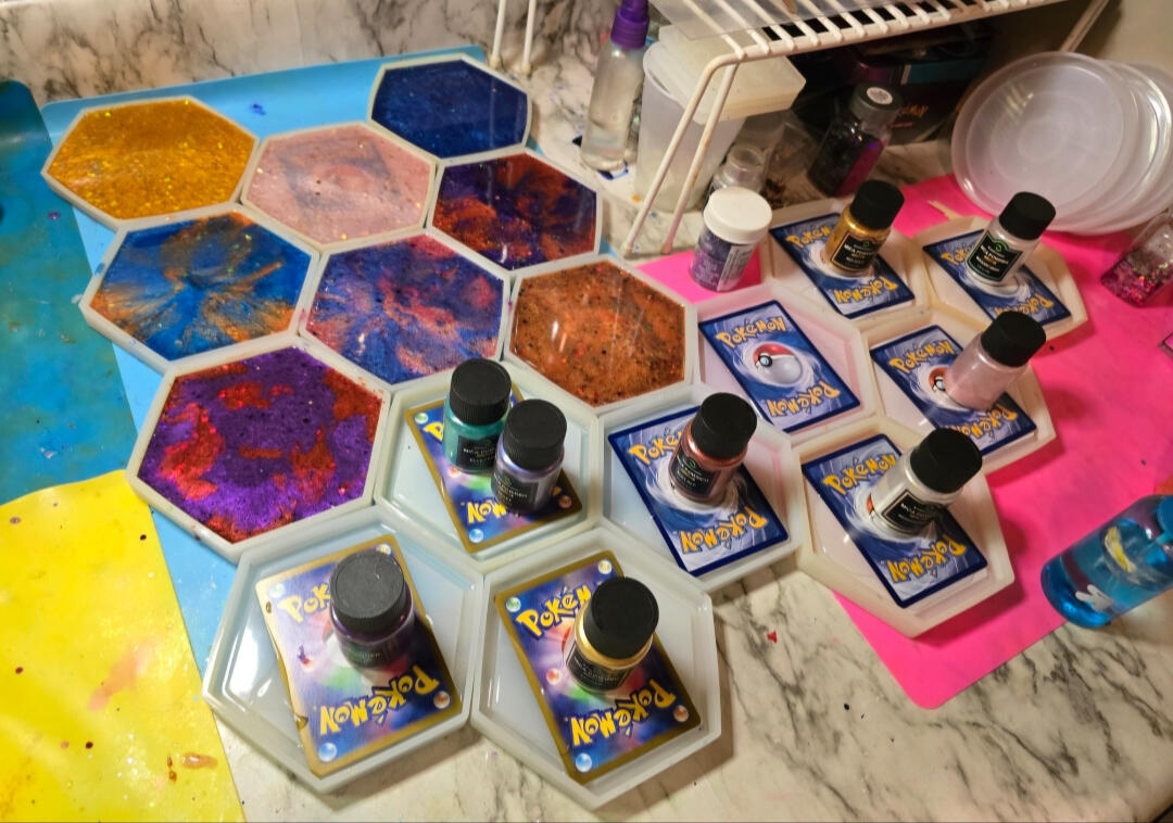 -For coasters I pour a base coat them place the cards face down and let cure.