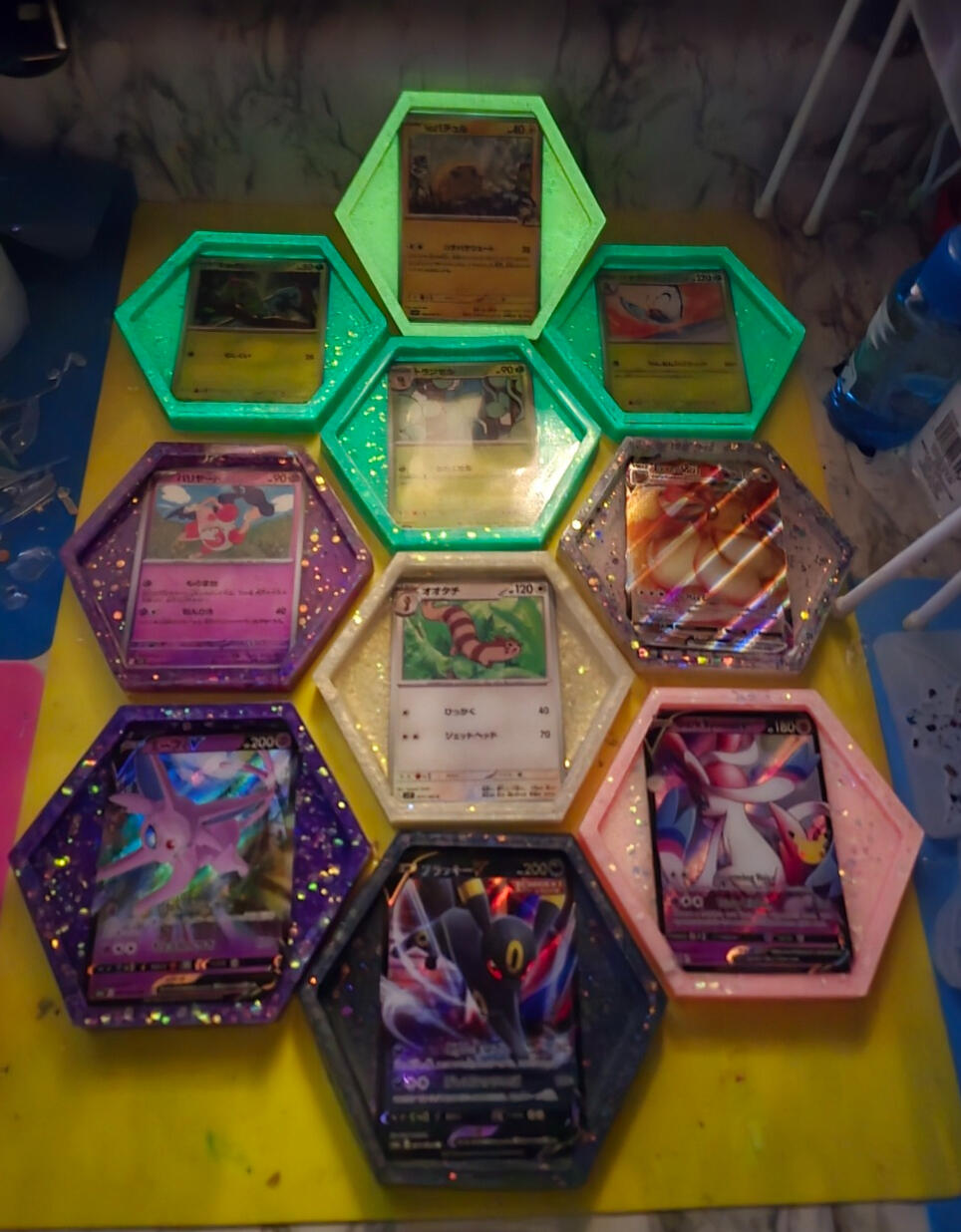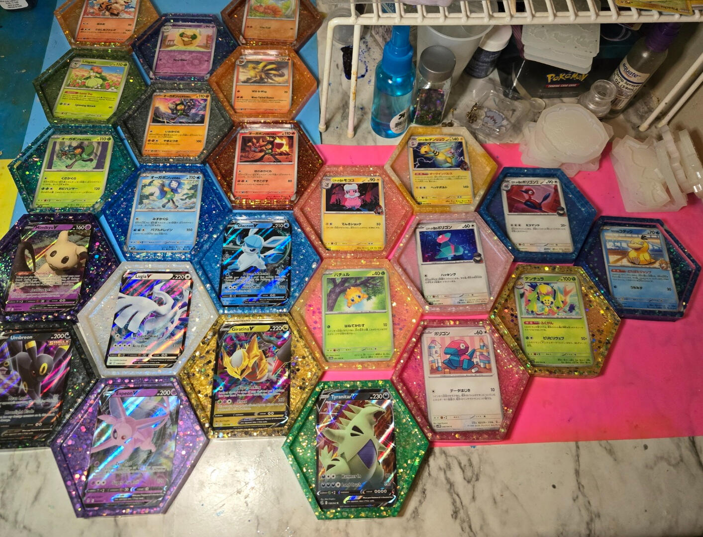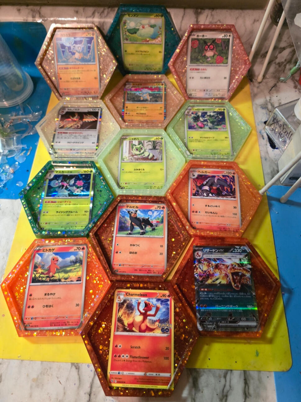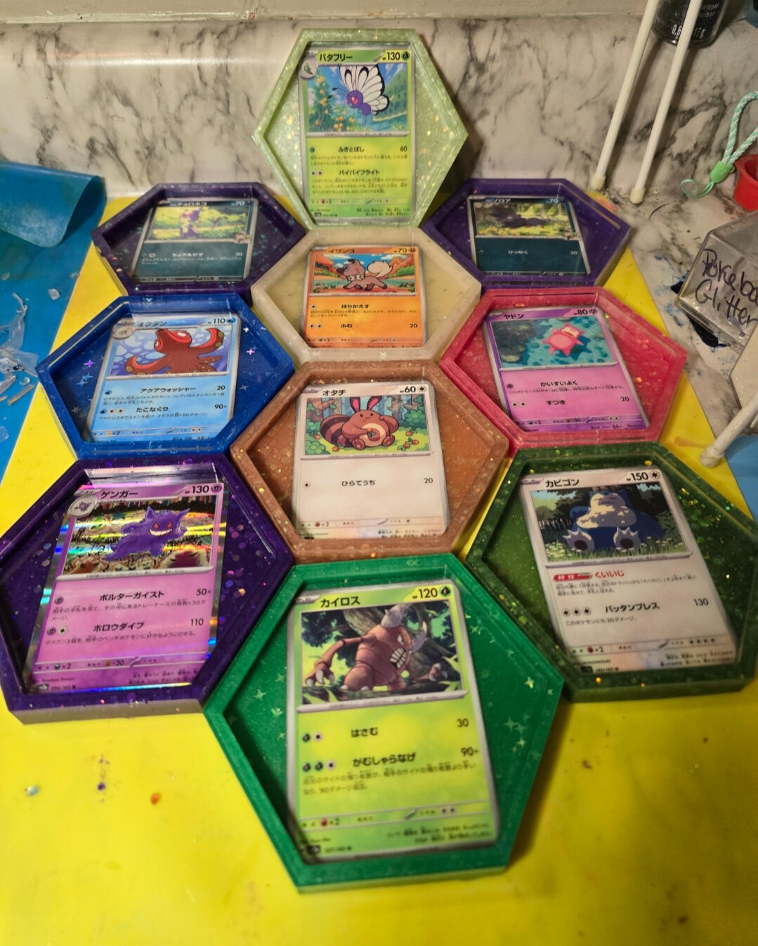 -For coasters I pour a base coat them place the cards face down and let cure.