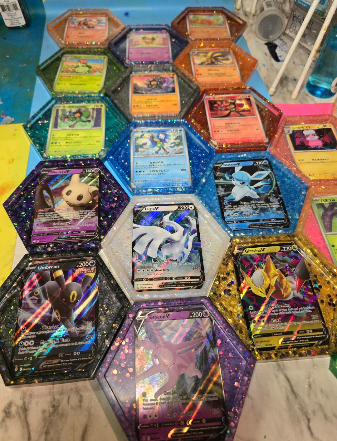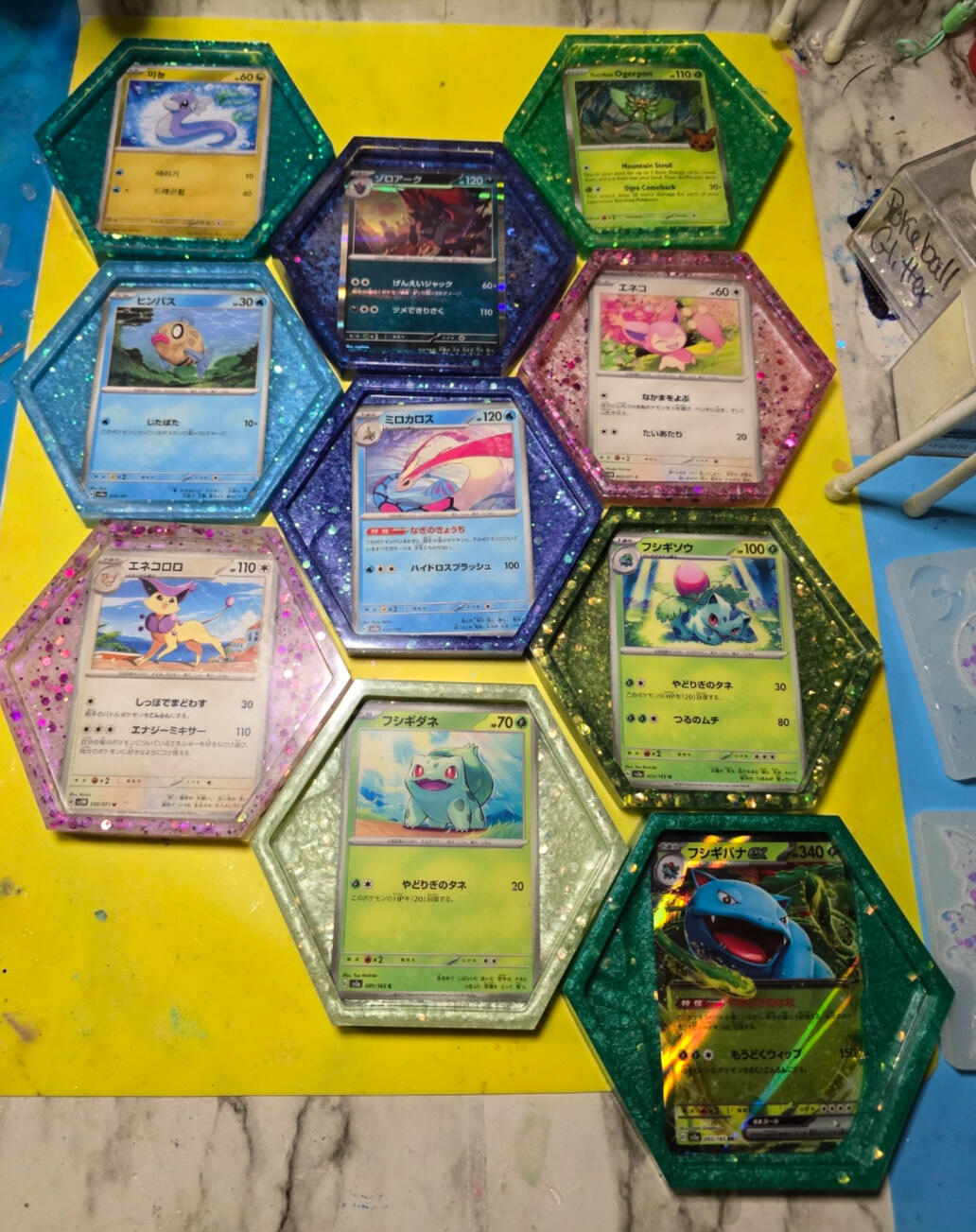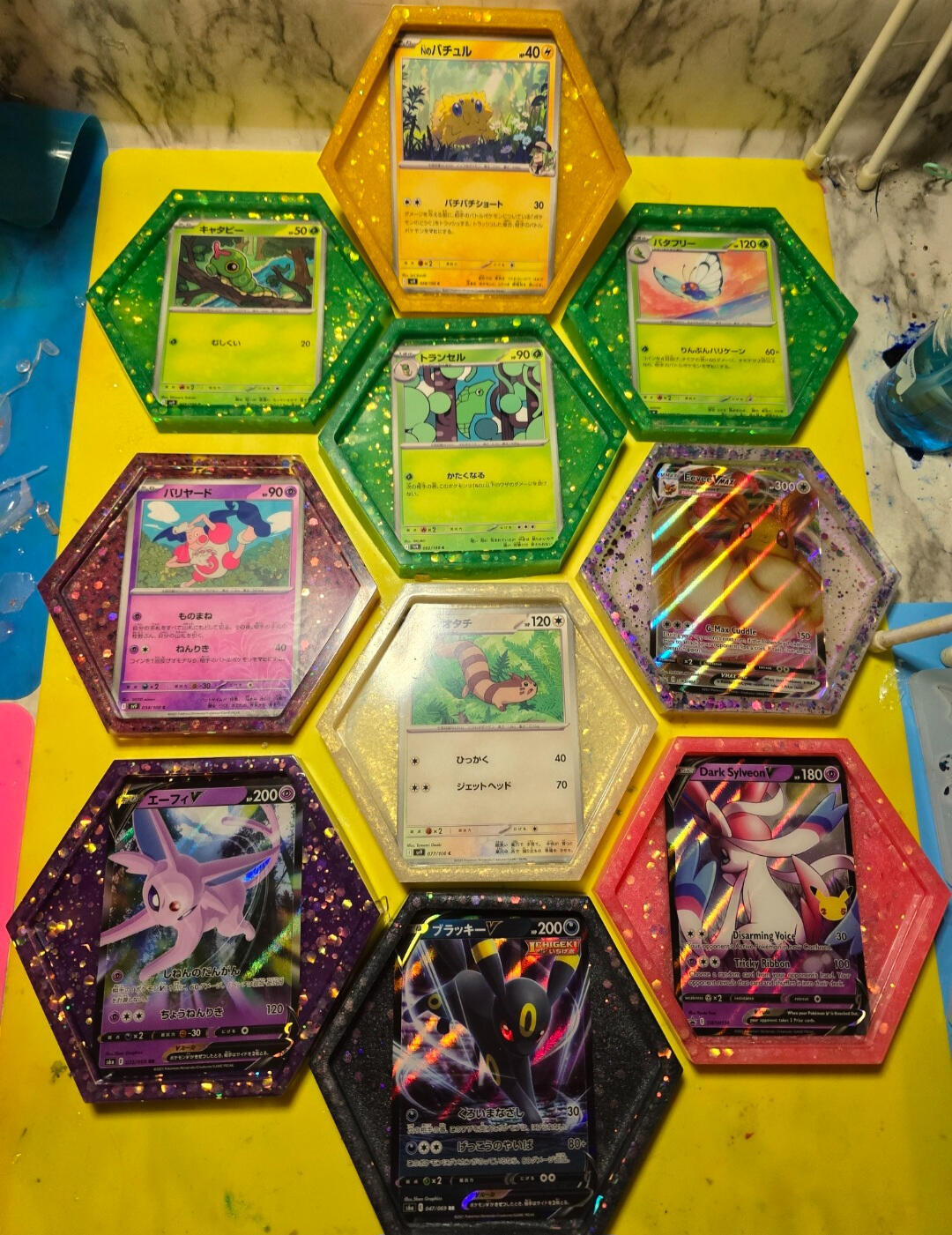 -Add colorful backing to the coasters after curing.